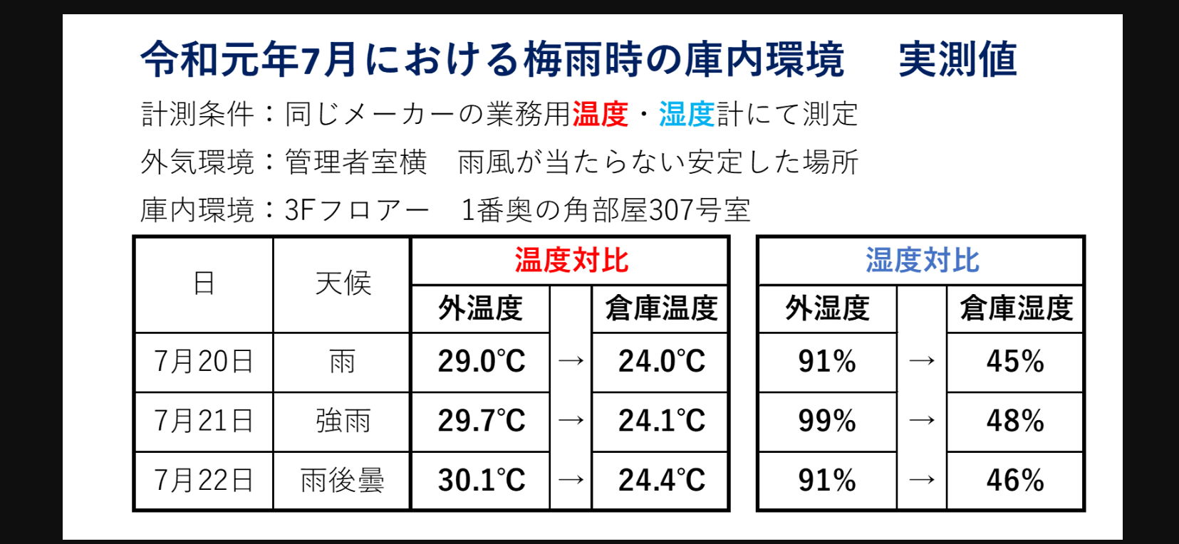 業務用の湿度調整システムをトランクルームとしては全国初で採用しました、本来は衛生管理の食品工場などに多くは採用されているシステムですが、年間を通して湿度を管理し、日本の梅雨時期や夏場の蒸し暑い時期にエアコンを使用せずに温度と湿度を管理する事が出来ます。客様の大切な財産をお守りする最も優れたシステムです
